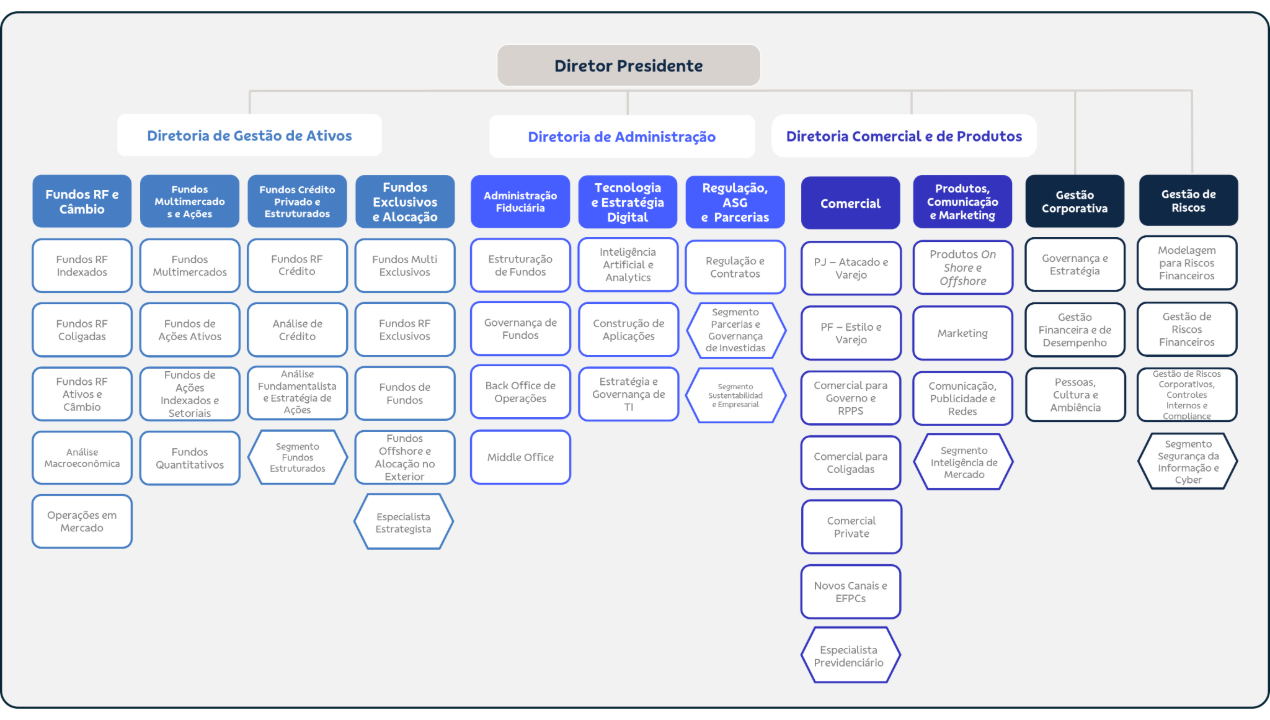Adotamos o modelo de administração baseado na decisão colegiada em todos os níveis, apoiados por comitês internos de caráter deliberativo. Essa estrutura contribui para a mitigação de riscos e promove a integração de diferentes perspectivas e análises, agregando valor e qualidade às decisões. Além disso, favorece o compartilhamento de conhecimentos e responsabilidades.